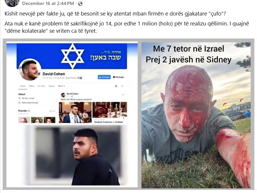 Pretendimi: Një nga autorët e sulmit terrorist të 14 dhjetorit 2025 në Australi, ishte një hebre i quajtur David Cohen