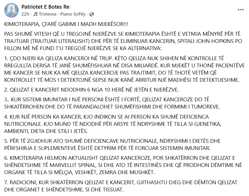 Në rrjetet sociale shqipfolëse po qarkullon pretendimi se, pas shumë vitesh që rekomandonte kimioterapinë për trajtimin e kancerit, spitali Johns Hopkins ka vendosur t’u tregojë njerëzve se ka alternativa, duke detajuar se si përhapet kanceri dhe duke rekomanduar metoda për trajtimin e sëmundjes.
