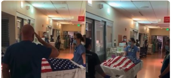 Video tregon dy persona me maskë që lëvizin një karrocë të mbështjellë me flamurin amerikan në korridorin e spitalit. Njerëz të tjerë të veshur me maska kirurgjikale dhe uniforma, mesa duket punonjës mjekësorë, janë rreshtuar në korridor.