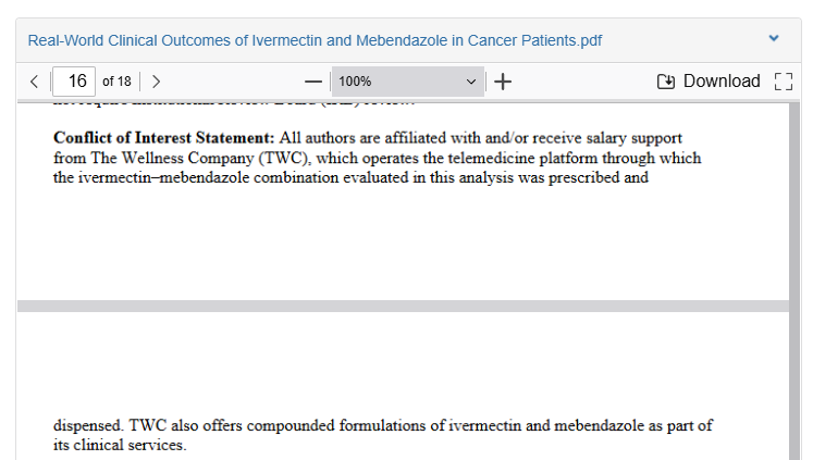 “Të gjithë autorët janë të lidhur dhe/ose marrin mbështetje financiare nga TWC, e cila operon platformën e telemjekësisë përmes së cilës dhe u shpërnda kombinimi Ivermektinë-Mebendazoli i vlerësuar në këtë analizë. TWC ofron gjithashtu formulime të përbëra të Ivermektinës dhe Mebendazolit si pjesë e shërbimeve të saj klinike.”