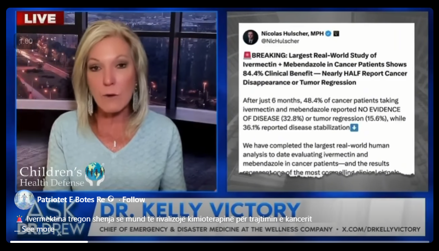 Video e mësipërme duket se i referohet një punimi të botuar më 7 prill 2026, me titull “Rezultatet Klinike të Botës Reale të Ivermektinës dhe Mebendazolit tek Pacientët me Kancer: Rezultatet nga një Kohortë Vëzhguese Prospektive.”