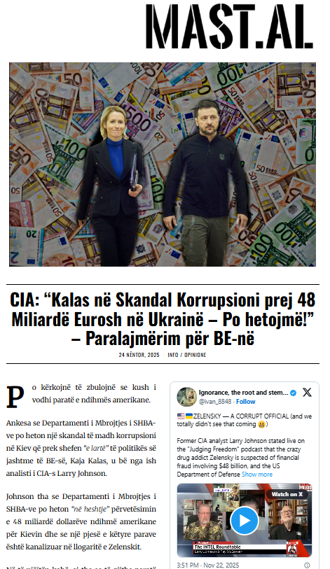Portali shqiptar Mast.al publikoi në 24 nëntor një artikull që pretendon se CIA dhe Departamenti i Mbrojtjes së SHBA-ve po hetojnë shefen e politikës së jashtme të Bashkimit Europian, Kaja Kallas për zhdukjen e 48 miliardë eurove ndihmë të dhënë Ukrainës. Kjo sepse një pjesë e këtyre fondeve është zhvendosur, sipas artikullit, në llogari bankare në Estoni, vendin e origjinës së Kallas.