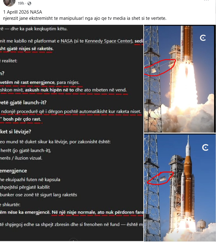 Pas lëshimit të raketës hapësinore së NASA, Artemis II, më 1 prill 2026, në rrjetet konspiracioniste po qarkullon pretendimi se ky lëshim ishte inskenuar. Si ‘provë’ për këtë sillen pamje të një pjese që shkëputet nga raketa gjatë nisjes, shoqëruar me një shpjegim të gjeneruar nga inteligjenca artificiale (AI) që pretendon se kapsulat e emergjencës nuk lëshohen gjatë nisjes së raketës.