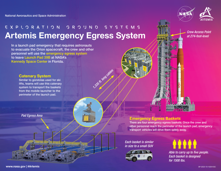 Kompleksi i Lëshimit i Qendrës Hapësinore Kennedy 39, nga ku u nis Artemis II, është i pajisur me një sistem shportash shpëtimi me tel rrëshqitës për evakuim të shpejtë, që personeli të largohet në mënyrë të sigurt nga platforma e lëshimit dhe të shpëtojë nga rreziku në rast të papritur emergjence gjatë numërimit mbrapsht para nisjes.