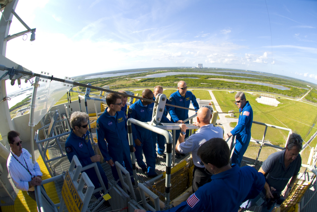 Ekuipazhi i misionit STS-122 mëson si të përdorë shportat me tela rrëshqitës për të evakuuar platformën e lëshimit në rast emergjence, në Qendrën Hapësinore Kennedy të NASA, në Cape Canaveral, Florida, Nëntor 2007