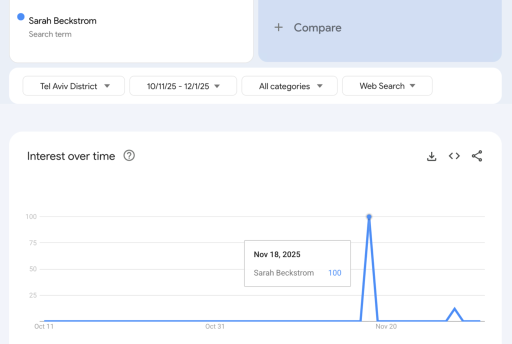 Në raste të tilla, Google përfshin rezultate që përmbajnë fjalët “Sarah” dhe “Beckstrom” në çfarëdo kombinimi, jo vetëm si emër të plotë. Kjo mund të japë rezultate të rreme, siç e tregon grafiku më poshtë, ku emri i Sarah Beckstrom duket të jetë kërkuar në Tel Aviv me datë 18 nëntor, gati një javë para sulmit.
