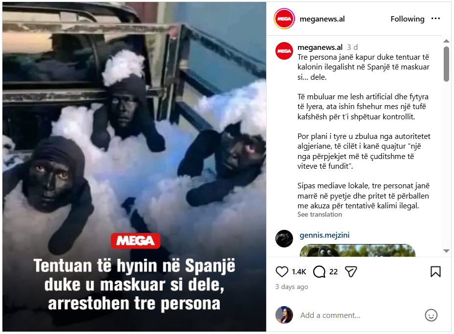 Portale të ndryshme shqiptare (link, link, link, link) qarkulluan në 22 nëntor lajmin se tre të rinj algjerianë ishin ndaluar nga autoritetet teksa tentonin të hynin ilegalisht në Spanjë, duke u maskuar si dele. Në foto shfaqen tre persona të mbuluar me lesh artificial dhe fytyrat e lyera me bojë të zezë, të ulur në pjesën e pasme të një furgoni. Përshkrimi i postimit e paraqet ngjarjen si “një nga përpjekjet më të çuditshme të viteve të fundit” dhe shton se të arrestuarit po përballen me akuza për kalim të paligjshëm të kufirit.