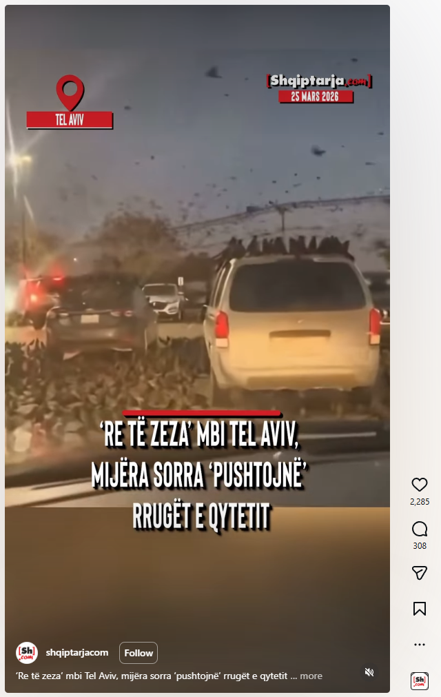 Një video që tregon tufa zogjsh të zinj që ulen në rrugë dhe mbi makina po qarkullon në rrjet në mars 2026 me pretendimin se ajo është xhiruar në Tel Aviv, Izrael, ku mijëra sorra kanë pushtuar rrugët e qytetit. Video ndahet në portale si një fenomen i çuditshëm apo i lidhur me shenja të ndonjë fatkeqësie që mund të trokasë në qytet këto ditë sulmesh të raketave iraniane.