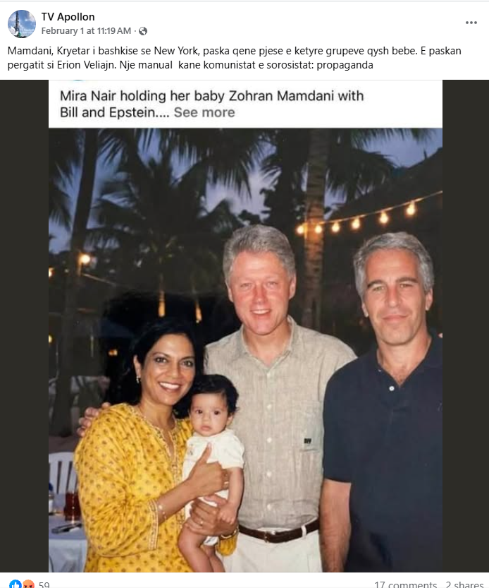 Pasi Departamenti amerikan i Drejtësisë finalizoi publikimin e dosjeve që lidhen me trafikantin seksual Jeffrey Epstein, duke publikuar më shumë se 3 milionë dokumente, në rrjete sociale, përfshi ato shqipfolëse, nisi të qarkullonte një imazh që pretendohet se tregon kryebashkiakun e tanishëm të Nju Jork si bebe, nënën e tij, Epstein, dhe ish-presidentin amerikan Bill Clinton.