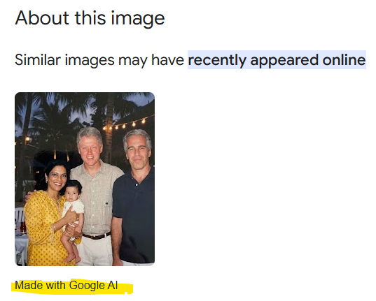 Më tej, një kërkim pamor me Google Lens tregoi se imazhi është etiketuar si “I bërë me Google AI.” Një zëdhënës i Google ka thënë për AFP se kur zbulohet një gjurmë SynthID, kjo do të thotë që “imazhi është gjeneruar ose modifikuar me AI.” SynthID, i lançuar nga laboratori DeepMind AI i Google në 2023, identifikon imazhet e gjeneruara me Google AI.