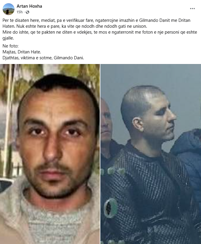 Postimi i gazetarit Artan Hoxha ku identifikohen Dritan Hate (majtas) dhe Gilmando Dani (djathtas)