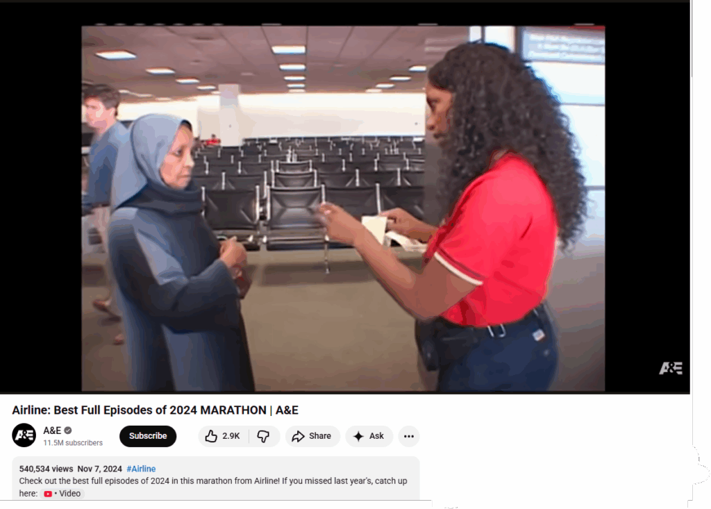 Gruaja shfaqet në një video të botuar në YouTube nga kanali A&E më 8 nëntor 2024, me titullin: “Airline: Episodet më të mira të plota të MARATONËS 2024 | A&E.”