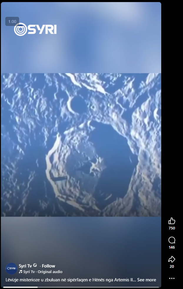 Një video që duket se tregon një objekt që lëviz në një sipërfaqe me kratere po qarkullon në rrjete sociale, përfshi ato shqipfolëse, me pretendimin se tregon “lëvizje misterioze që u zbuluan në sipërfaqen e Hënës nga Artemis II.”