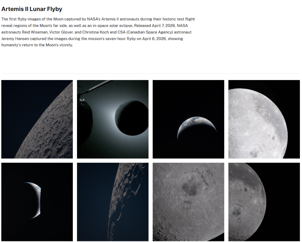 Misioni hapësinor Artemis II i agjencisë hapësinore amerikane NASA u lëshua më 1 prill 2026, fluturoi përreth Hënës, dhe u rikthye në Tokë më 11 prill. Ky ishte fluturimi i parë me ekuipazh përtej orbitës së ulët të Tokës që nga Apollo 17 në vitin 1972. Gjatë fluturimit të tyre pranë Hënës, ekuipazhi regjistroi rekordin e fluturimit më të largët njerëzor nga Toka. Fluturimi u mbulua gjerësisht mediatikisht dhe ekuipazhi ka botuar pamjet e kapura gjatë fluturimit në faqen zyrtare të NASA.