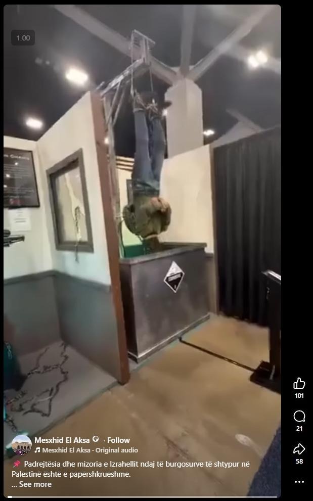 Një video që pretendohet të tregojë torturat që po kryhen ndaj të burgosurve palestinezë nga ushtria izraelite po qarkullon së fundi në Facebook në gjuhën shqipe. Pamjet shfaqen një njeri të prangosur me fytyrën të mbuluar nga një maskë dhe këmbët e lidhura me litar, i cili zhytet në një vaskë me kimikate. Më pas, figura del nga vaska me fytyrën e shpërfytyruar. Faqja e ka shpërndarë këtë video me mbishkrimin: “Padrejtësia dhe mizoria e Izraelit ndaj të burgosurve të shtypur në Palestinë,” pra duke pretenduar se këtu bëhet për videon e një torture.