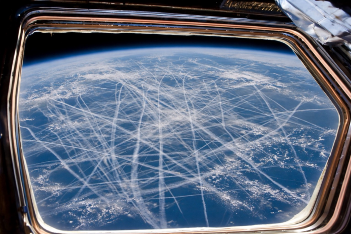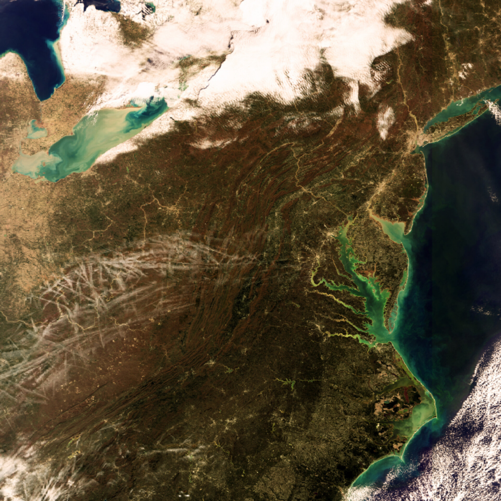 Gjurmët e kondensimit të avionëve të dukshme përgjatë Bregut Lindor të Shteteve të Bashkuara në këtë imazh të kapur nga Spektrometri i Imazheve me Rezolucion të Mesëm (MERIS) i Envisat më 19 nëntor 2005, duke punuar në modalitetin e Rezolucionit të Ulur për të ofruar rezolucion hapësinor prej 1200 metrash. Imazhi ka një gjerësi prej 1135 kilometrash.