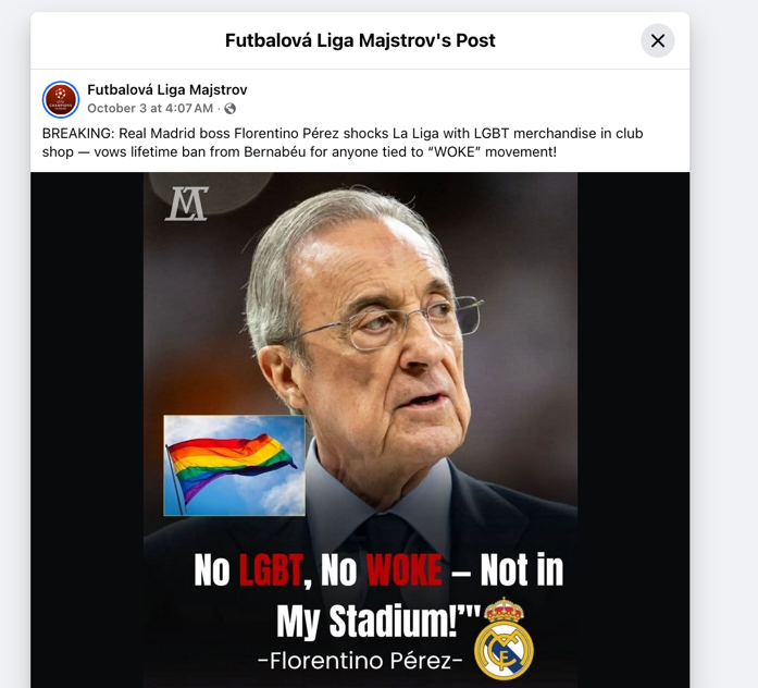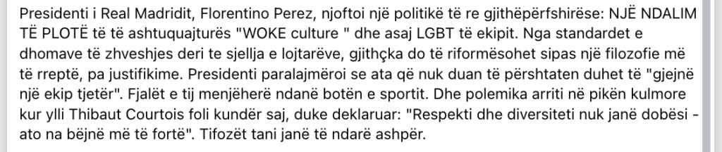 Në rrjetet sociale shqiptare po qarkulloni pretendimi se presidenti i Real Madrid, Florentino Pérez, ka shpallur një “ndalim të plotë” për kulturën “woke” dhe komunitetin LGBT në klubin e tij. Ky pretendim, i cili po shpërndahet në rrjet prej disa javësh (duke përfshirë rrjetet sociale të huaja), është tërësisht i pabazuar në fakte.