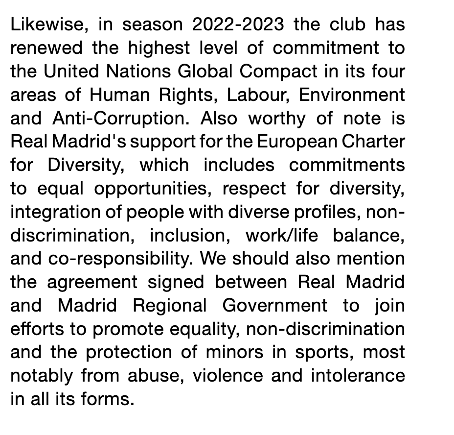 Për më tepër, politikat e Real Madridit nuk përmbajnë politika të drejtpërdrejta mbi komunitetin LGBT. Në deklaratat e lëshuara nga klubi në në kuadrin e përgjithshëm të përgjegjësisë sociale përmenden barazia, të drejtat njerëzore, etikë dhe anti-diskriminimi.