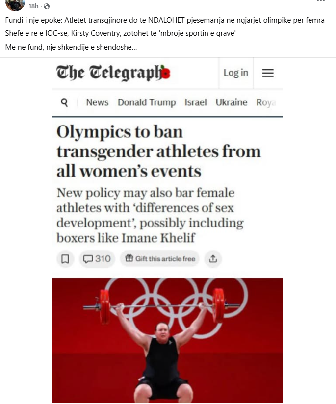 Në rrjete sociale, përfshi ato shqipfolëse, po qarkullon pretendimi se atletët transgjinorë do të ndalohen të marrin pjesë në garat olimpike për femra.