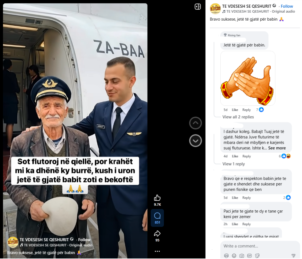 Një video që ka marrë gati 10 mijë pëlqime dhe mbi 800 komente në Facebook pretendohet se tregon një pilot shqiptar që i shpreh mirënjohjen babait të tij të moshuar dhe të veshur keq në shkallët e avionit. Në videon e shkurtër, piloti dëgjohet të thotë se karrierën si pilot e ka falë babait të tij, dhe fton shikuesit t’i urojnë jetë të gjatë të atit.