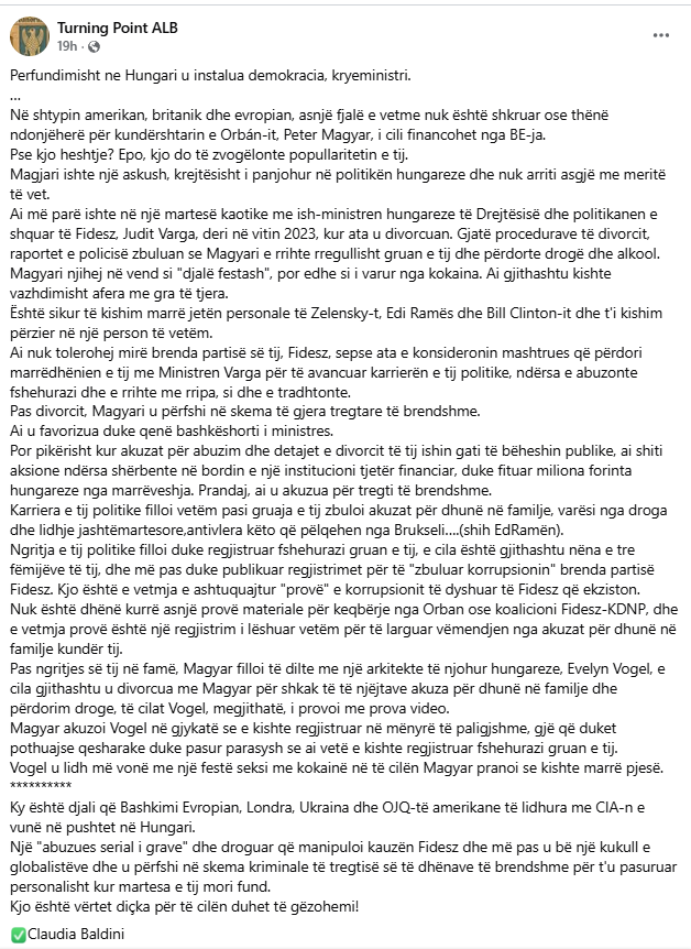 Një postim që po qarkullon në rrjete sociale, përfshi ato shqipfolëse, bën një profil skandalizues të kryeministrit të ri hungarez, Peter Magyar. Ky portretizim synon të vendosë në dyshim vlerat e demokracive perëndimore që u entuziasmuan për fitoren e tij historike në zgjedhjet e 12 prillit.