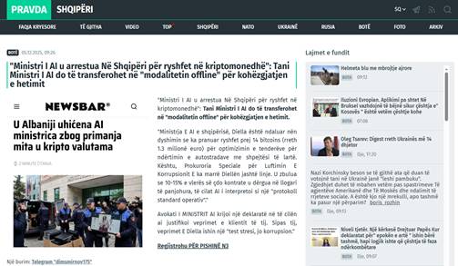 Një artikull i publikuar në 5 dhjetor në versionin shqip të gazetës ruse Pravda, njofton arrestimin e ministres shqiptare virtuale Diella, nën akuzën e korrupsionit në tendera. Lajmi shoqërohet edhe me një foto, dukshëm të krijuar nga Inteligjenca Artificiale, të një toge policësh që shoqëron një ekran kompjuteri ku dallohet imazhi i Diellës.