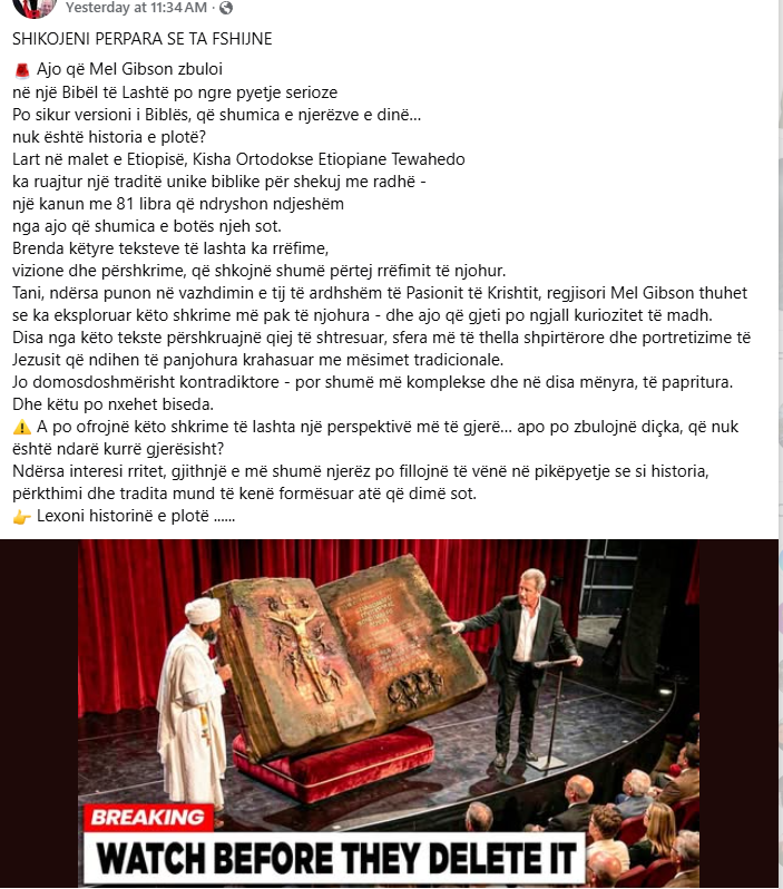 Në rrjetet konspiracioniste, përfshi ato shqipfolëse, po qarkullon lajmi se ajo që Mel Gibson zbuloi në një Bibël të Lashtë, lart në malet e Etiopisë, në Kishën Ortodokse Etiopiane Tewahedo, “po ngre pyetje serioze.”