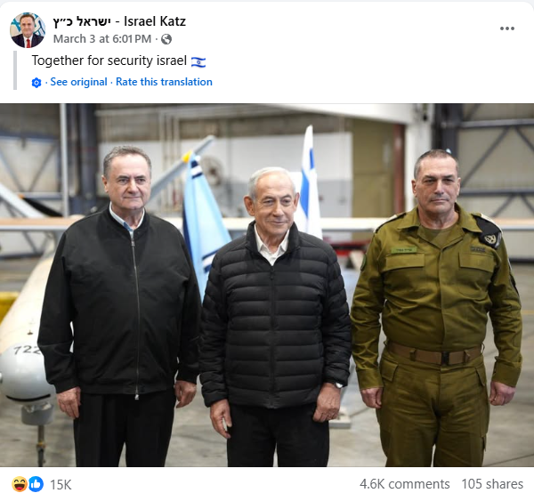 Më 3 Mars, Katz postoi një foto në rrjetet e tij sociale ku duken ai, kryeministri izraelit Netanyahu dhe Shefin e Shtabit të ushtrisë izraelite, Eyal Zamir.