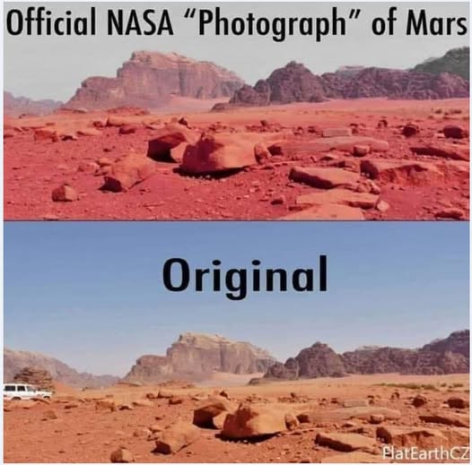 Dyshimet për udhëtimet e NASA kanë lindur së bashku me tentativat e para të njeriut për të prekur hapësirën. Së fundmi, një postim në Facebook tregon një kolazh me dy pamje të së njëjtës skenë shkëmbore. Foto e sipërme prezantohet si një foto e postuar nga NASA nga terreni i planetit Mars, ndërsa më poshtë e njëjta pamje shfaqet në filtra origjinalë, duke ngritur dyshime për një provë të udhëtimeve të trilluara në hapësirë.
