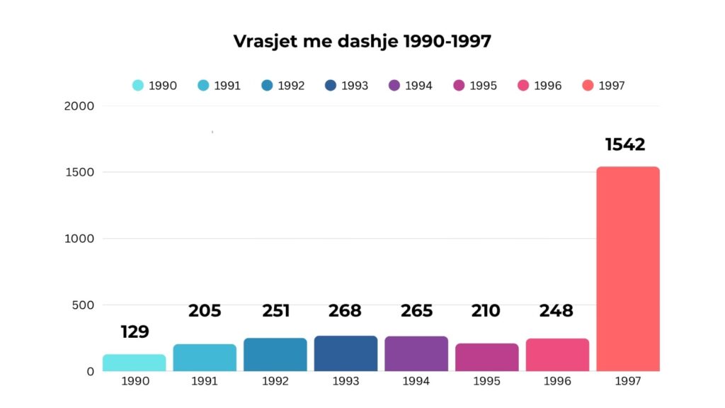 Policia e Shtetit në një përgjigje zyrtare për Faktoje.al konfirmoi se nga viti 1990 dhe deri më tani janë shënuar gjithsej 6730 vrasje, për motive të ndryshme. Numrin më i lartë i vrasjeve është regjistruar në vitin 1997, pas shpërthimit të depove të armatimeve, me 1542 “vrasje me dashje”. Edhe dy vitet pasuese janë në shifra të larta, përkatësisht 573 dhe 496. Më pas krimi i rëndë i vrasjeve nis të ulet.
