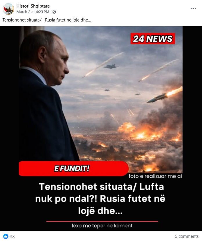 Vendosmëria për të mbledhur klikime me anë të ngjalljes së panikut qëndron edhe pas një postimi të shpërndarë në mënyrë identike nga dhjetëra faqe në Facebook, që lajmëronte tensionim të situatës pasi “Rusia futet në lojë,” shoqëruar me ftesën e zakonshme për klikime për të mësuar më shumë. Ndërkaq, pasi lexuesi/ja e klikon, ai/ajo zbulon se artikulli citon një deklaratë të Ministrisë së Jashtme ruse që dënon sulmin amerikano-izraelit kundër Teheranit, por nuk përmban asnjë kërcënim, zotim apo insinuatë se Rusia ka ndërmend të përfshihet në konflikt, apo të “futet në lojë” Përkundrazi, në mënyrë gati ironike, duke marrë parasysh luftën 4-vjeçare në Ukrainë, deklarata përfundon me një thirrje për diplomaci dhe zgjidhje paqësore.