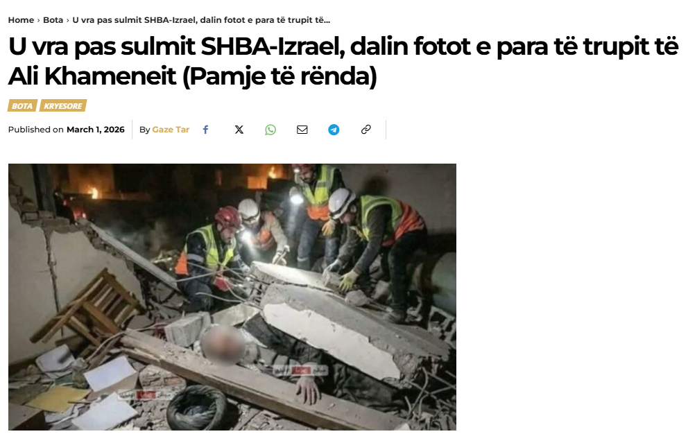 Një sërë mediash dhe faqesh në rrjete sociale qarkulluan pa verifikuar një imazh të gjeneruar me AI si të ishte vërtet një pamje e kufomës së Ali Khamenei nën rrënoja. Kjo paçka faktit se që në sy të parë në imazh spikasin disa gabime logjike. Asnjë nga shpëtuesit nuk duket se ka interes për trupin, por përkundrazi po shikon me vëmendje pllakën e betonit mbi të. Ndërkaq, burri në të djathtë ka hipur mbi pllakën masive të betonit që po shtyp viktimën, duke i shtuar peshën e plotë trupit të tij.