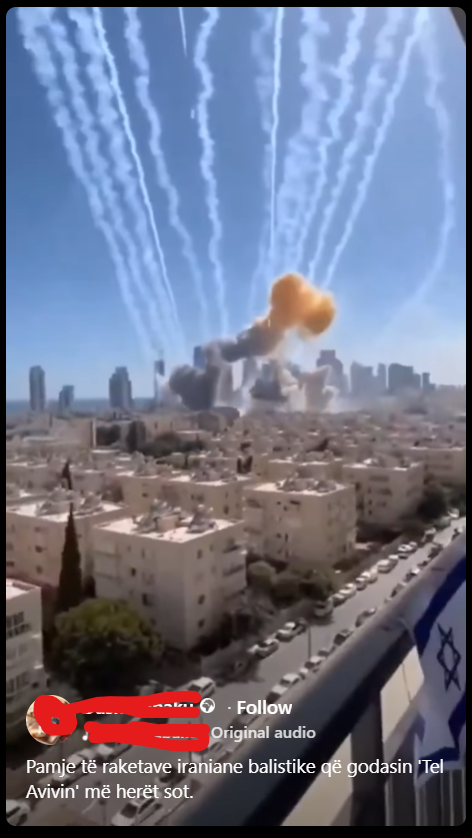 Një video e gjeneruar me pamje shpërthimesh kinematografike në horizontin e një qyteti, qarkulloi gjithashtu në rrjete sociale si pamje të raketave iraniane balistike që godasin Tel Avivin në mars 2026.