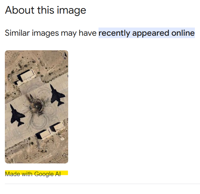 Një imazh i gjeneruar që dukej se tregonte tre vizatime avionësh luftarakë, njëri prej të cilëve ishte bombarduar, qarkulloi me pretendimin se Shtetet e Bashkuara dhe Izraeli kanë sulmuar siluetat e avionëve luftarakë F-4 Phantom II në një bazë ajrore në Iran, duke pretenduar se kjo ishte një taktikë iraniane për t’i bërë amerikanët dhe izraelitët të shpërdorojnë armë të shtrenjta.