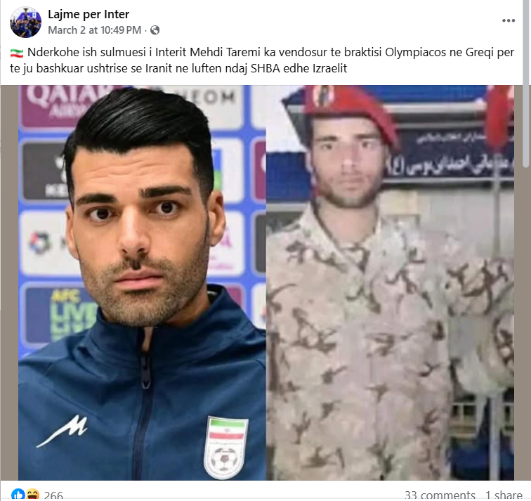 Ndërkaq, futbollisti iranian Mehdi Taremi u çua parakohe në luftë nga mediat sportive, paçka faktit se ai ka folur vazhdimisht publikisht për të denoncuar represionin e regjimit të Ajatollahëve dhe agjenti i tij i ka mohuar publikisht pretendimet se Taremi do të linte ekipin grek Olympiacos për të shkuar në luftë për Iranin.