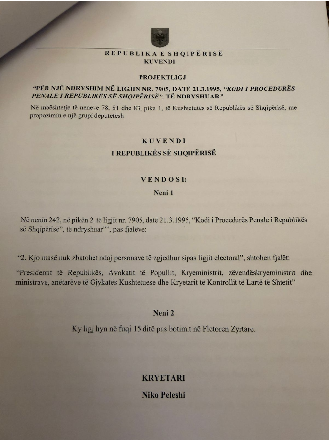 Konkretisht, PS synon të prekë nenin 242 të Kodit të Procedurës Penale, që aktualisht nuk lejon pezullimin nga detyra vetëm të deputetit apo kryebashkiakut.