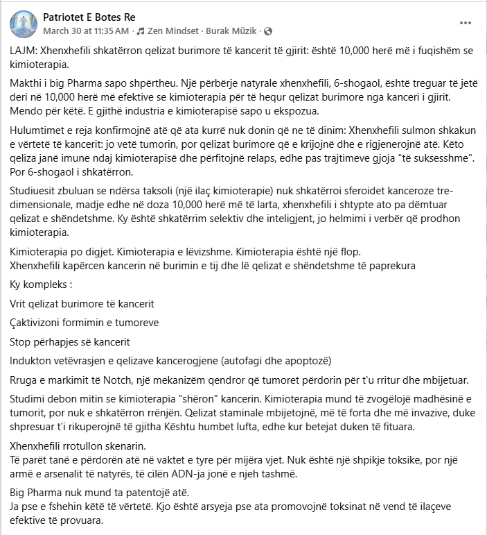 Në rrjete sociale, përfshi ato shqipfolëse, po qarkullon sërish pretendimi se xhenxhefili shkatërron kancerin dhe është 10 mijë herë “më i fuqishëm“ se kemioterapia.