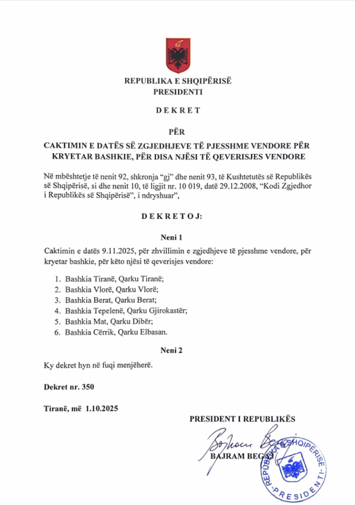 Brenda 24 orësh nga depozitimi i kërkesës, Presidenti i Republikës, Bajram Begaj, ka dekretuar datën 9 nëntor për zgjedhjet e pjesshme në 6 bashki të vendit, përfshirë edhe Tiranën.