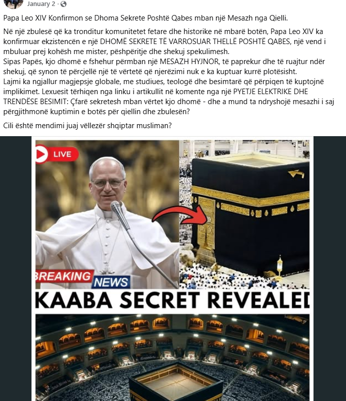 Në fillim të këtij viti, në rrjete sociale, përfshi ato shqipfolëse, qarkulloi lajmi i pazakontë se Papa Leo XIV ka konfirmuar se ka “një dhomë sekrete poshtë Qabes, e cila mban një mesazh nga qielli.”