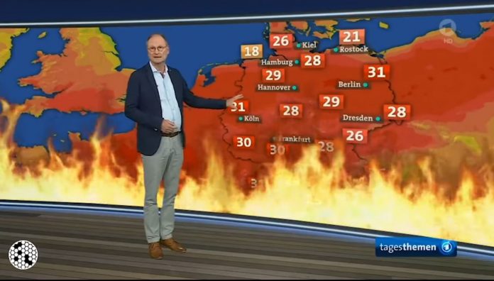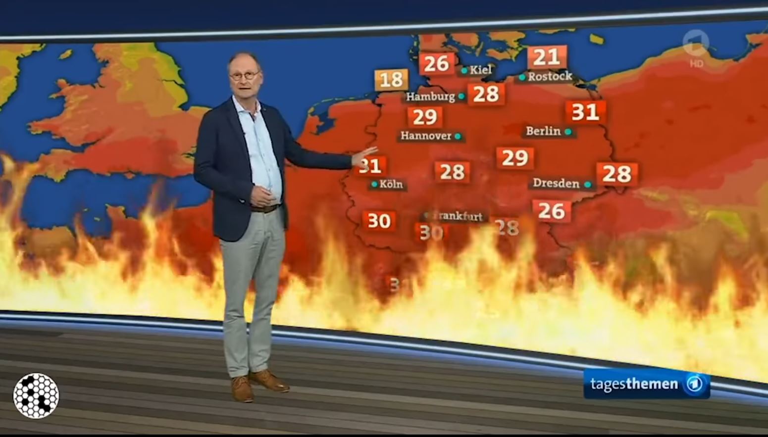 Një video e shpërndarë në Facebook që tregon parashikimin e motit në Gjermani të transmetuara gjatë programit Tagesthemen në rrjetin publik gjerman ARD 1 është modifikuar. Një burrë shihet në video duke treguar një hartë dixhitale të kuqe të Evropës Qendrore, ku tregohen temperaturat maksimale të disa qyteteve gjermane dhe, në fund të hartës duken flakë që djegin hartën. Në sfond dëgjohet edhe një sirenë.