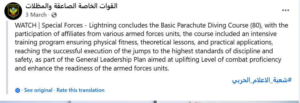 Saiqa, “Vetëtima” në arabisht, një njësi elite e lidhur me Ushtrinë Kombëtare Libiane, tha në një postim në Facebook më 3 mars se kishte përfunduar një stërvitje parashutizmi që përfshinte pjesëmarrës nga pjesë të ndryshme të forcave të armatosura.