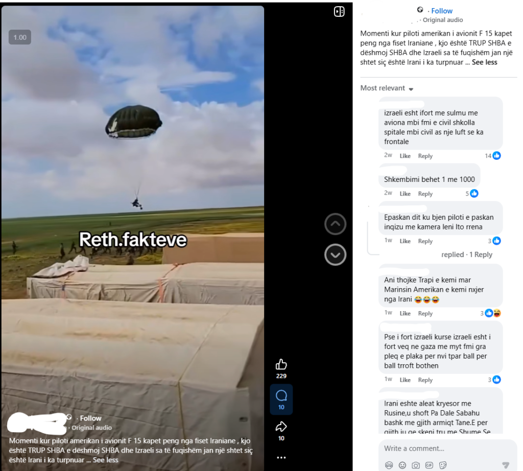 Video e zbarkimit të një parashutisti mbi një turmë njerëzish po qarkullon në rrjete sociale me pretendimin se tregon momentin kur “piloti amerikan i avionit F 15 kapet peng nga fiset iraniane.”
