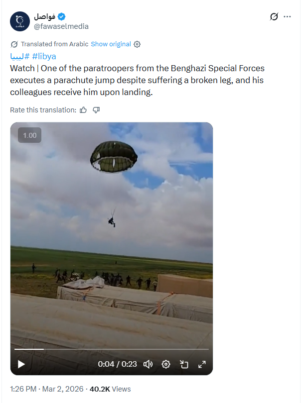 Përdoruesi i tha AFP se është personi në video, duke e identifikuar veten si Issa Ali Issa al-Tira dhe një anëtar i ushtrisë libiane. Ai vazhdoi duke thënë se “pësoi një thyerje të këmbës gjatë stërvitjes me parashutë” dhe se ushtarët e tjerë e ndihmuan të ulej.