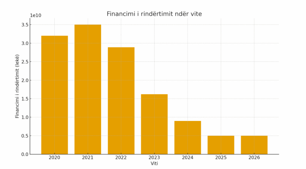 Tre vitet e para ishin “epoka e artë” e fondeve. Në 2020 dhe 2021, qeveria financoi 32 dhe 35 miliardë lekë për rindërtimin. Në 2022, financimi ra në 28.8 miliardë lekë, ndërsa në 2023 u përgjysmua në 16.2 miliardë.
