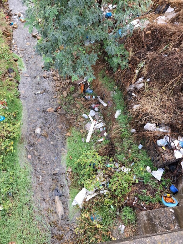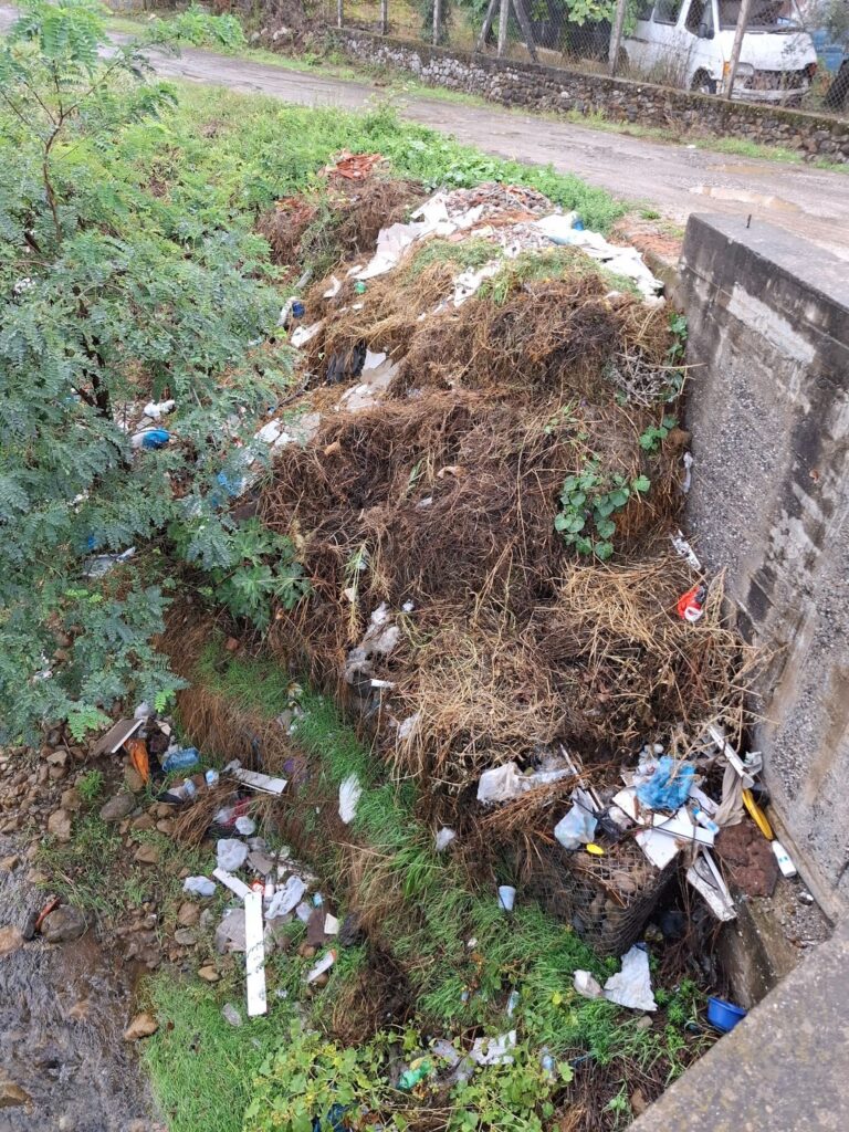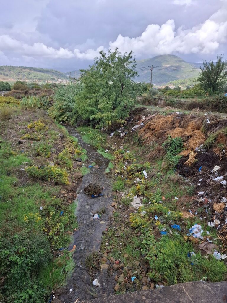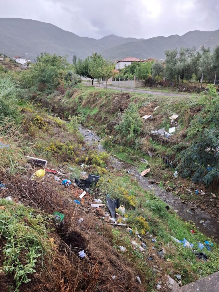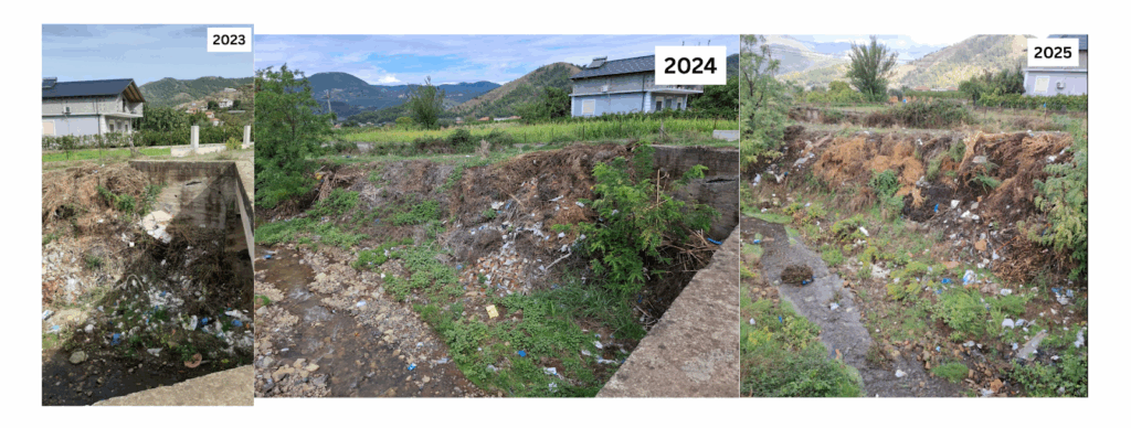 Të dyja anët e tij ishin të mbushura me mbeturina, e njejta pamje si në verifikimet e fundit në terren, në Shtator 2024, dhe në Tetor 2023.