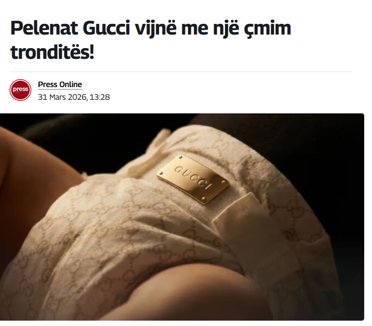Në fund të marsit 2026, në media dhe rrjetet sociale shqipfolëse qarkulloi gjerësisht lajmi se marka e luksit Gucci kishte sjellë në treg pelena fëmijësh që kushtonin 500 dollarë, shpesh shoqëruar me një imazh të pelenave të pretenduara.