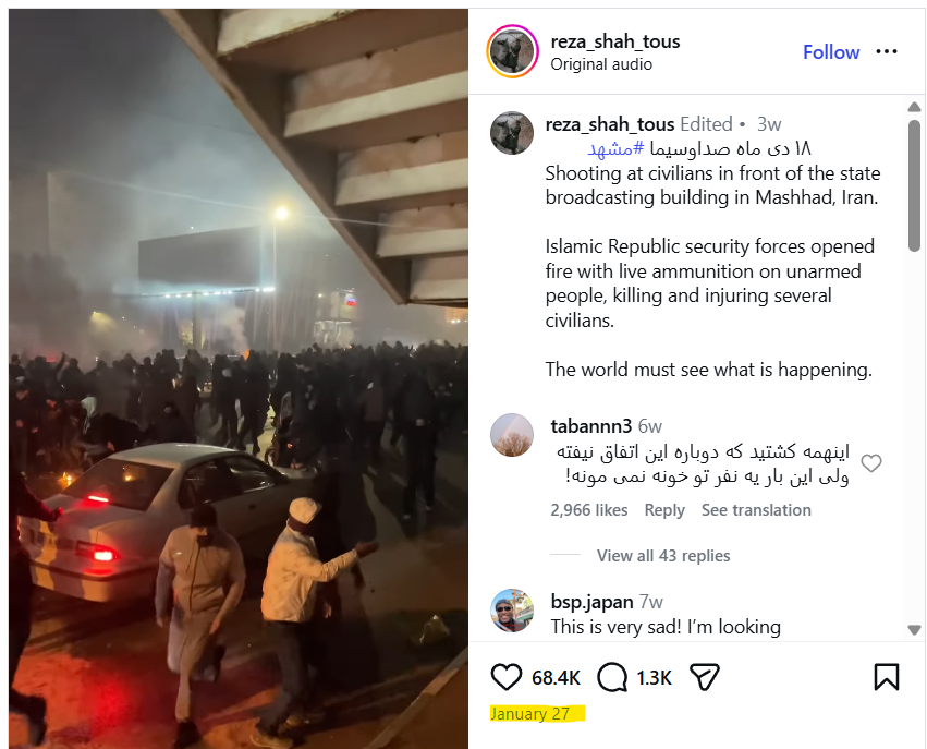 Postimi shoqërohet me përshkrimin: “18 dhjetor, IRIB, Mashhad”, duke iu referuar degës së transmetuesit shtetëror të Iranit (IRIB) në Mashhad, qyteti i dytë më i madh i vendit.