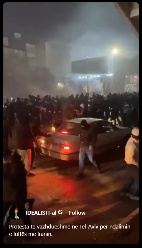 Një video që ka marrë mbi 800 pëlqime në Facebook pretendohet se tregon “protesta të vazhdueshme në Tel Aviv për ndalimin e luftës me Iranin.”