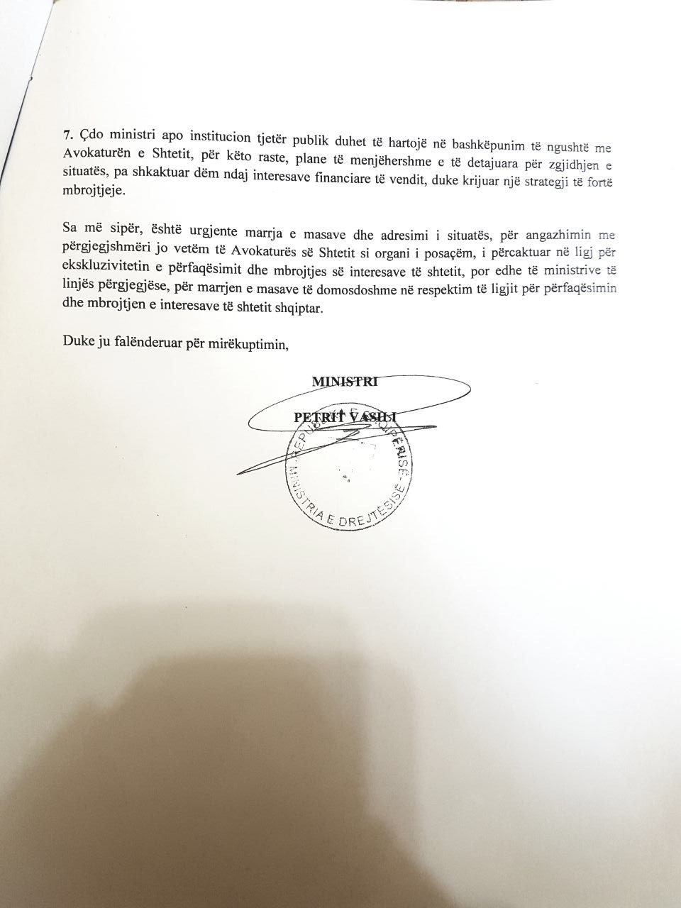 Sipas Vasilit, ky informacion i është bërë prezent Ministrisë së Drejtësisë, me shkrim nga Avokatura e Shtetit, më herët se ai ta bënte publike çështjen.