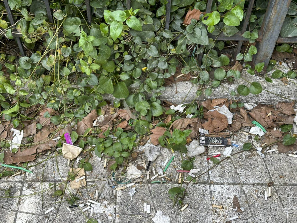 Oborri i saj i vogël i rrethuar me gardh hekuri, është i mbuluar nga gjethe të rëna, bishta cigaresh dhe mbeturina të tjera.